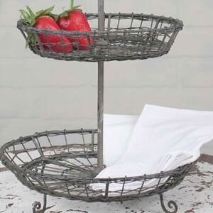 NEW in box! Super cute for your shabby or farmhouse decor! You can display anything you desire on this sweet wire two tier stand. Use it as a center piece with small greenery and decor or for a cupcake cookie, or fruit displayStand measures 8¼'' dia x 12¼''H. Breaks down for easy storage.