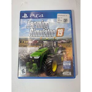 Farming Simulator 19 for PlayStation 4 in original case with cover art. Includes disc in good condition. Rated E for Everyone. Features over 300 vehicles and tools, multiple crops including cotton and oats, and farm animals such as horses. Play solo or with up to 16 players online.
