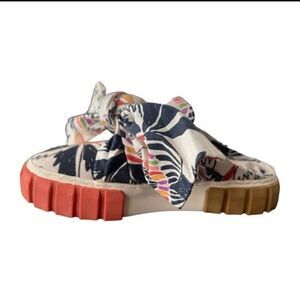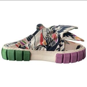 A chunky platform bumper sole brings multiple hues to this bow-tied mule sneaker in a fun parrot print.