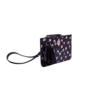 Lightweight crossbody made of PETA approved vegan leather, black with multicolored polka dots. Features: adjustable/removable strap, additional wristlet, tassel accent.