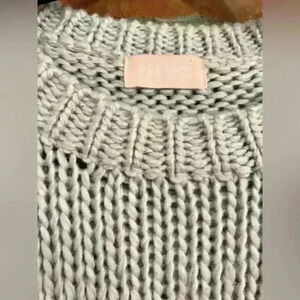 Grey sweat with white fringe. Knit sweater, slightly cropped. Perfect with high waist jeans. Fringe is on the sleeves as well as around the waist.