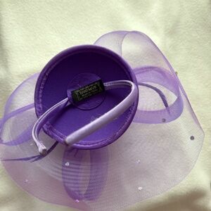 Get ready for the cup! Headband Fascinator with Golden Stones, Purple Feathers. Slight, side set.