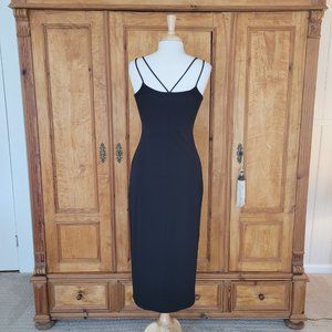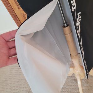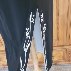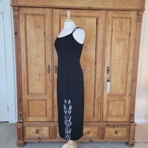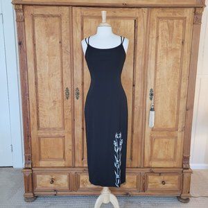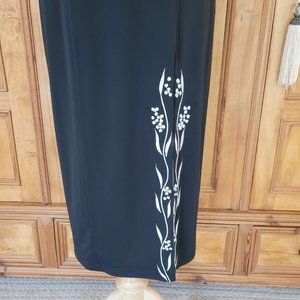 Gorgeous cocktail dress with lovely, embroidered detail on the 18" side slit. Double shoulder straps.