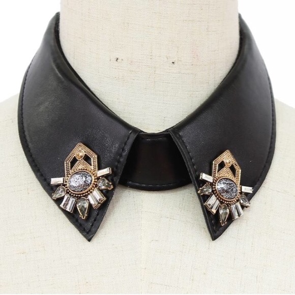 Choker Style Bib/Collar Necklace; Faux Leathet; Black; 14inWidth; 4inDrop; Crystal Stud
