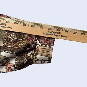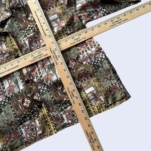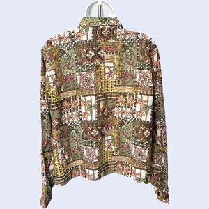 Vintage-style button blouse in earthy brown/green with a collared neckline and regular fit. Silky polyester feel. 90s/retro boho vibe with tiled patchwork print. Condition: Good preowned with normal wear.