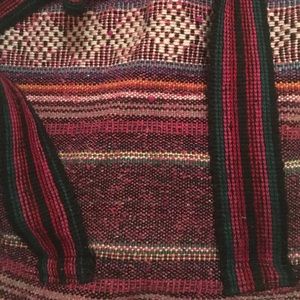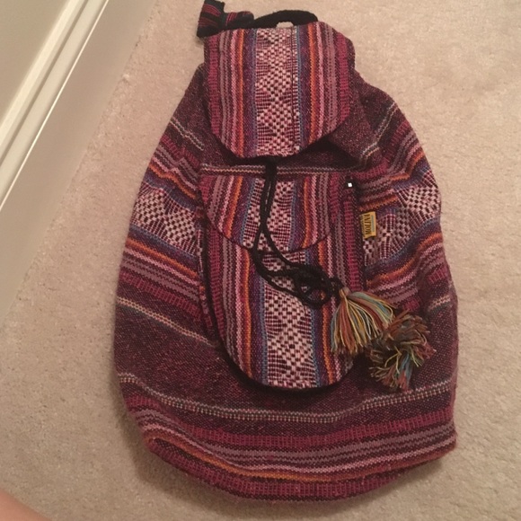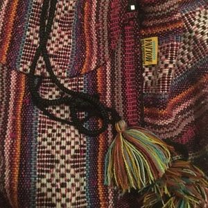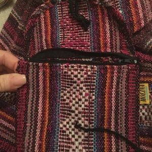 Zipper front pocket. Drawstring big pocket with flap. Very cute. Only used once. Mint condition.