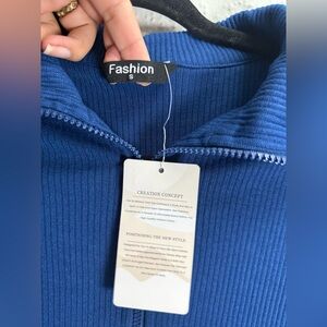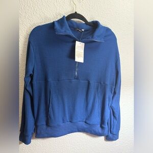 Stay cozy and stylish with this Fashion brand quarter-zip pullover sweater in a rich royal blue. Made with a ribbed texture for a modern look, it features a half-zip front, kangaroo-style pocket, and relaxed fit. Perfect for layering in casual or lounge outfits. Size Small (S), New With Tags (NWT).