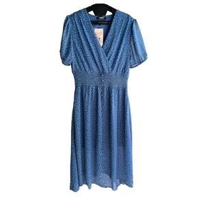 Fashion Blue V Neck Midi Sheer Lined Dress Elastic Waist Boho Chic, Size S