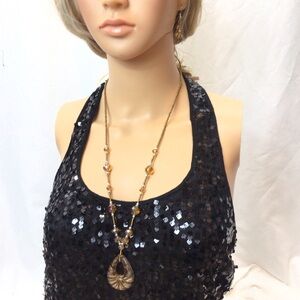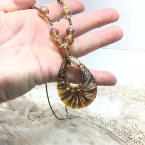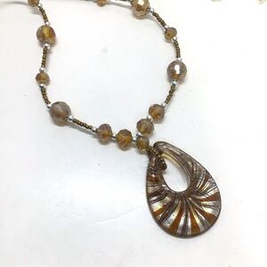 - fashion statement necklace with brown and gold beading and shiny glass pendant highlighted with encased gold and silver metallic paint. Very unique and showy!