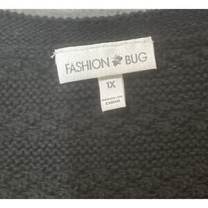 Fashion Bug women’s plus size 1X black short sleeve knit shrug cardigan. Features a lightweight open-weave textured knit, single button closure, and ribbed hem. Great layering piece for dresses, casual outfits, office wear, or special occasions.