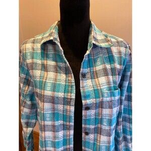 Fashion Bug Button Down Blouse Size 14 16 Turquoise Plaid Stripes 100% Cotton