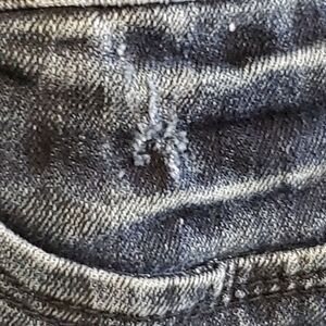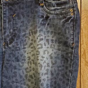 Super fun, leopard print jeans! The true color is the far away shots, sorry for the variation in the closeups. Features intentional fading on the front and back, with trimmed back pockets. There is a small spot of distressing near one of the front pockets, as seen in the pictures. I'm not sure if it was intentional, so wanted to disclose.