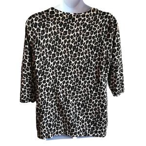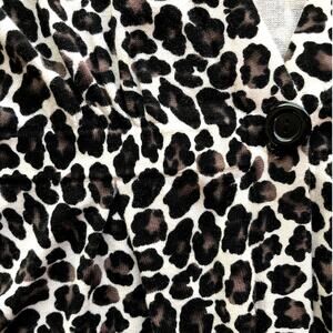 Fashion Bug cardigan in very good condition without much, if any, wear. No stains, pills, snags, fading or holes. Featuring a leopard print and single button closure, the cardigan has a "band" at the waist with slight gathers on top and pleats on the bottom front, creating a "flare". Size says 22/24W but NOTE: seems to run small. Actual measurements app'x 22 inches pit to pit, 21 across waist and 29 long. Sleeves are 3/4 length.