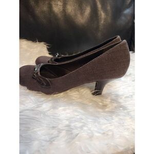 Fashion Bug Womens Size 7.5 Brown Fabric Slip On 3" Heel Pump