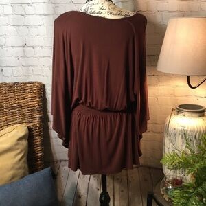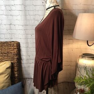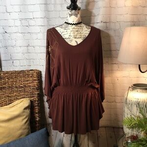 Rich brown with gold floral embroidered shoulder oversized bat wing sleeve with elastic waist. Gently preowned condition.