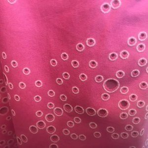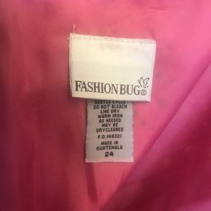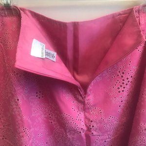 This Fashion Bug skirt is pink with an eyelet floral pattern. It is fully lined. The shell is 100% cotton and the lining is 100% polyester. Zips at the center back. New with tags. Approximate measurements (laying flat, unstretched) are:
