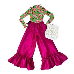 This stunning 3-piece fashion bundle is a show-stopping mix of bold color, texture, and flair. The fuchsia satin high-waist ruffle hem pants steal the spotlight with their voluminous silhouette and ultra-glossy finish. Pair them with either the green floral long-sleeve mesh top for a fresh, vibrant pop or the white faux-leather 3D rose crop top for a chic, romantic edge. Together, they create endless styling possibilities - perfect for brunches, events, date nights, or photoshoots. This bundle is the ultimate statement set for anyone who loves to mix elegance with fearless fashion.