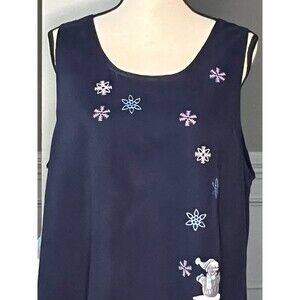This embroidered snowman Christmas maxi dress by Fashion Classics in navy blue is a vintage 1990's piece perfect for the winter season. The sleeveless design with a round neckline and pullover closure makes it easy to wear for casual occasions. Made from a comfortable blend of polyester and rayon, the long dress features intricate embroidery accents that add a festive touch,as well as snowflake shaped buttons at one side. Machine washable and available in size large, this dress is a stylish choice for women looking to spread holiday cheer in a fashionable way.