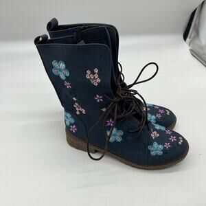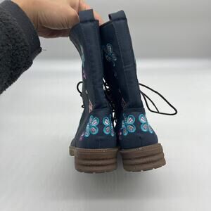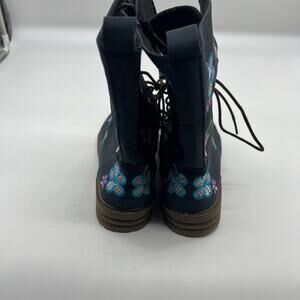 Fashion Combat Boots Floral Embroidered Faux Suede Lace Up Blue Navy Size 8US