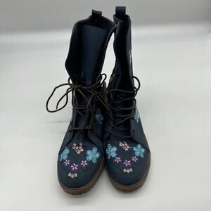 Fashion Combat Boots Floral Embroidered Faux Suede Lace Up Blue Navy Size 8US /39CN