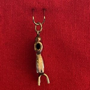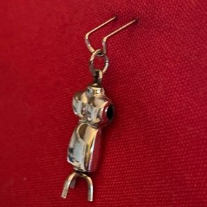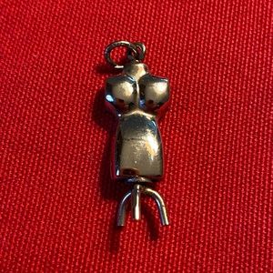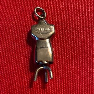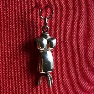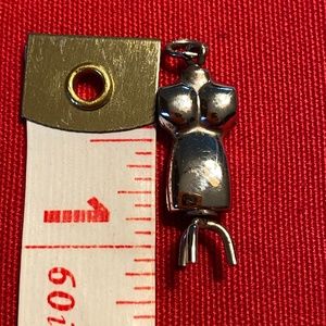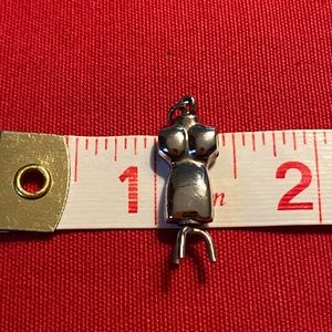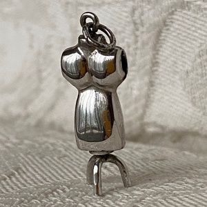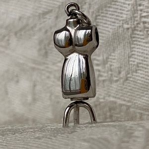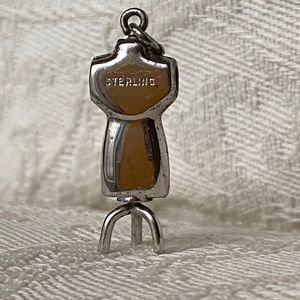 Adorable! A vintage sterling silver charm by Carl-Art, of a tripod holding a sewing mannequin/dress form. Carl-Art hallmark (CA w/arrow through it) shown in photo 3 on jump ring alongside "STG" for sterling. Sterling is also stamped on back of the charm, visible in photos. Photos 4-5 shown measurements. Has some wear not terribly visible w/naked eye because it's so reflective. Perfect for a current, or aspiring, fashion designer, dressmaker, seamstress, etc. Tripod turns, which rotates the ring.