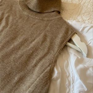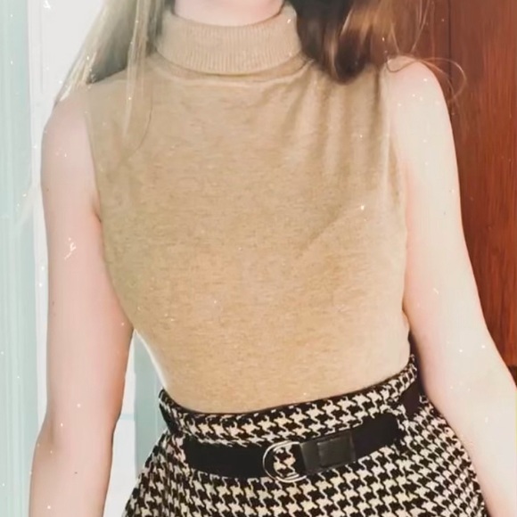 A beige, form fitted, sleeveless turtleneck sweater. Heathered on the torso, ribbed on the neck.