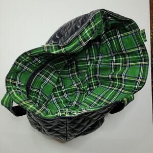 Fashion Express Quilted Reversible Faux Black Leather & Green Plaid Strap Tote