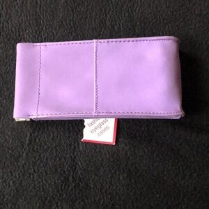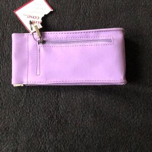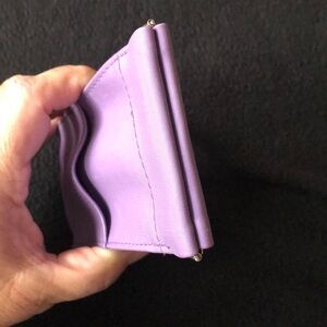 Darker purple than picture, squeeze open top, pocket on one side zipper pocket on other
