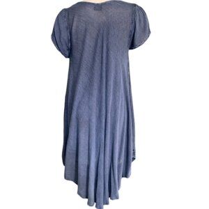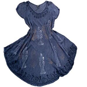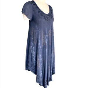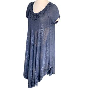 Description: Cotton Viscose Gauze Asymmetric Hem Short Sleeve Shift/Cover-up Dress Botanical/Floral Painted Design and Embroidered Accents.
