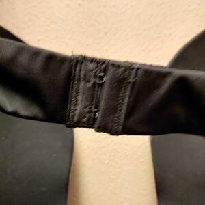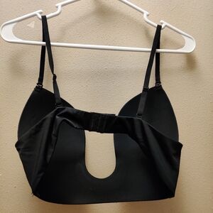 Black U-plunge bra. Deep neckline. Adjustable straps. Hook-and-eye closure.