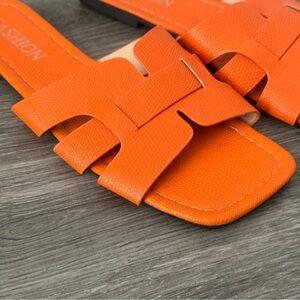 Elevate your casual look with these chic orange slide sandals from Fashion Forward. Designed for comfort and style, they are perfect for any casual outing.