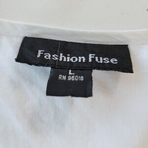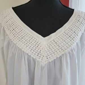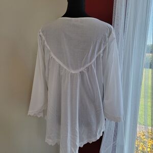 Fashion Fuse boho peasant blouse. Light and airy 00% white cotton with embroidered trims. V-neck. Butterfly sleeve measures 23.5" from shoulder. Measures 22" underarm seam to seam flat. 26.5" length. Size Large EUC