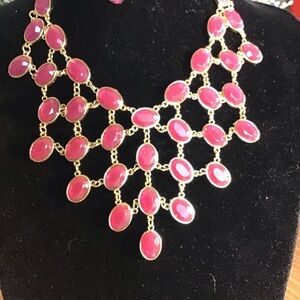 - chandelier style necklace with pink mauve rhinestones and gold-toned adjustable chain. Nice princess length.