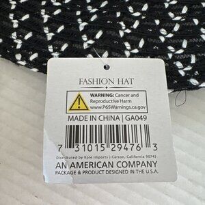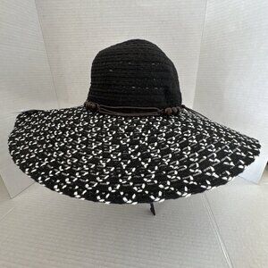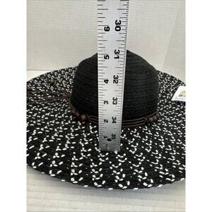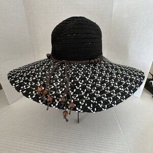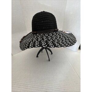Fashion Hat Wide Brim Woven Sun Hat Beaded String Band NWT Black & White with brown trim