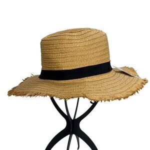 Fashion Hat Woven Sun Hat Fringed Grosgrain Ribbon Band NWT Tan Black 9034