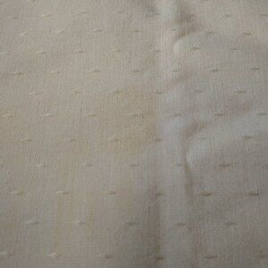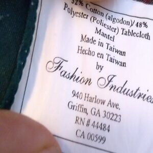 Vintage Fashion Industries Christmas tablecloth is 60 by 84 inches. It is made of 52% cotton and 48% polyester.