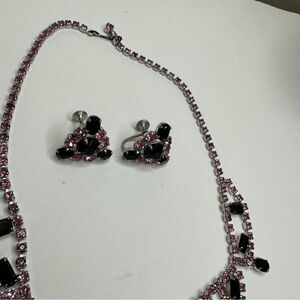 Fashion Jewelry Black and Pink Rhinestone Necklace and Screw Back Earrings
