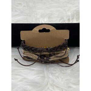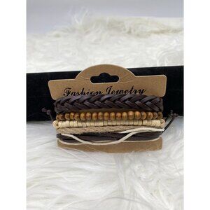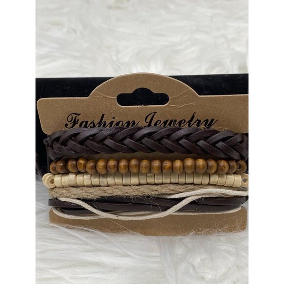 This bohemian-inspired bracelet set features a multi-layer design combining braided leather, wooden beads, and cord elements. An accessory that complements both casual and formal attire, it offers a stylish and earthy aesthetic with its natural tones.