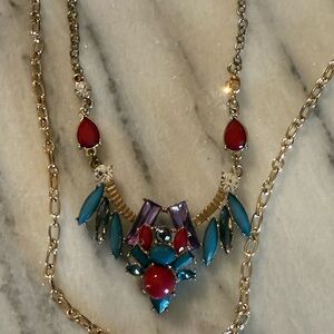 This Fashion Jewelry colorful double chain necklace with an Aztec pattern features a teardrop pendant in a multicolor design. The lobster closure and rope chain add a stylish touch to this necklace, making it perfect for various occasions such as engagements, weddings, anniversaries, birthdays, and more. The beauty and bohemian theme of this necklace makes it a unique and eye-catching accessory for any outfit. Perfect for adding a pop of color and flair to your ensemble.
