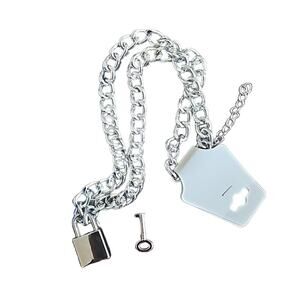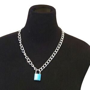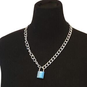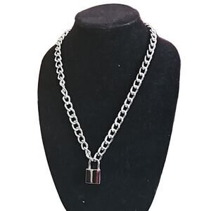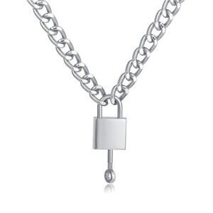 Lock pendant necklace, chunky chain necklace, fashion jewelry, silver-tone padlock necklace, punk style jewelry, hip-hop necklace, streetwear accessories, trendy statement necklace, gothic-inspired jewelry, unisex fashion necklace, edgy jewelry, bold chain choker, Y2K fashion, minimalist lock charm, industrial style necklace, statement jewelry piece, vintage-inspired padlock necklace.