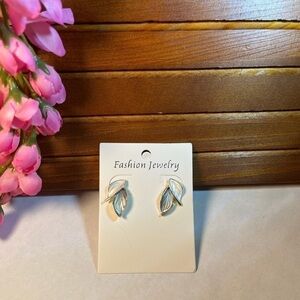 Fashion jewelry pierced earrings, gray and white leaf design. Gold tone trim.