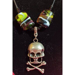 This handmade Fashion Jewelry Skull Necklace features multicolor glass beads on a corded chain. The pendant shape is a skull, and the necklace is adjustable for a personalized fit. It has a slide closure and is designed in a beaded style with a skull theme.