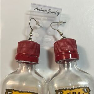 Quirky earrings with mini bottle design. Red caps add a bold accent. Great for a fun look.