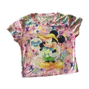 Cute Mickey Mouse graphic fashion logo t-shirt in good preowned condition. There is some dark sticker like residue on front. Please see last images. No other flaws. Unbranded.