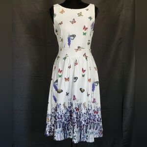 Fashion Mia - White Butterfly Dress. Knee length. Waist - 27", Shoulder to hem - 40 ", Waist to hem - 26". Silky soft - 95% Polyester and 5% Spandex. Zips up the back.