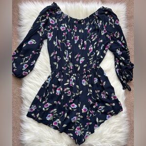 Fashion Nova 3/4 Sleeve Boho Floral Off Shoulder Mini Romper Playsuit Navy Blue
