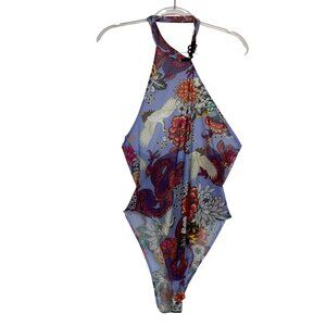 Fashion Nova Asian Dragon Floral Bodysuit Periwinkle Blue Size Large Sexy Sheer