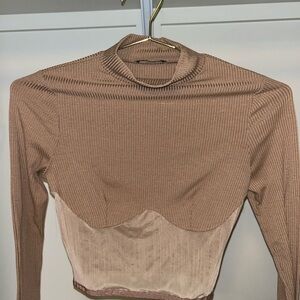 Elevate your style with this chic beige long sleeve mock neck top. Perfect for any occasion, it offers a sleek and sophisticated look.