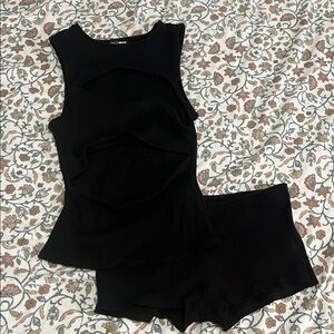 Stylish black top with bold cut-out design. Sleeveless and form-fitting. Perfect for a night out.