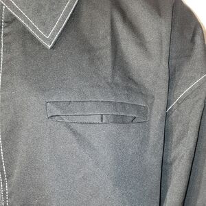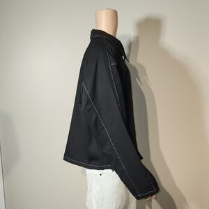 Sleek black jacket with contrast white stitching. Features a classic collar and zip closure. Ideal for layering.